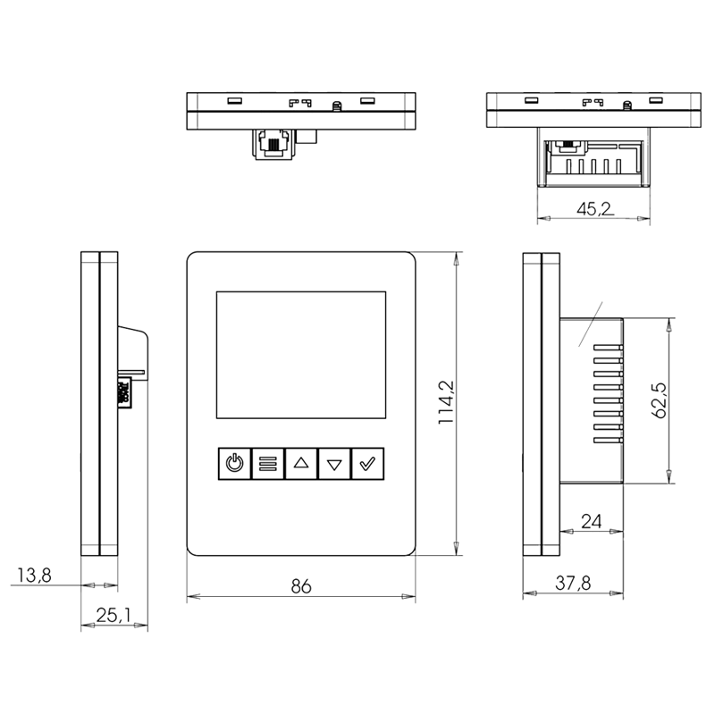- 3 czujniki temperatury: wewnątrz, na zewnątrz, strumień powietrza