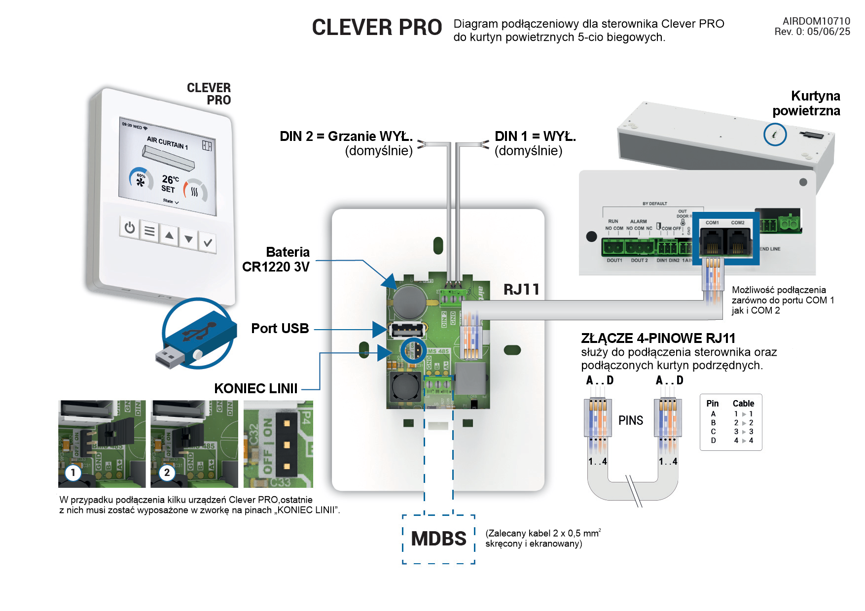 - Połączenie Modbus do zarządzania kurtynami powietrznymi podłączonymi do sterownika Clever PRO.