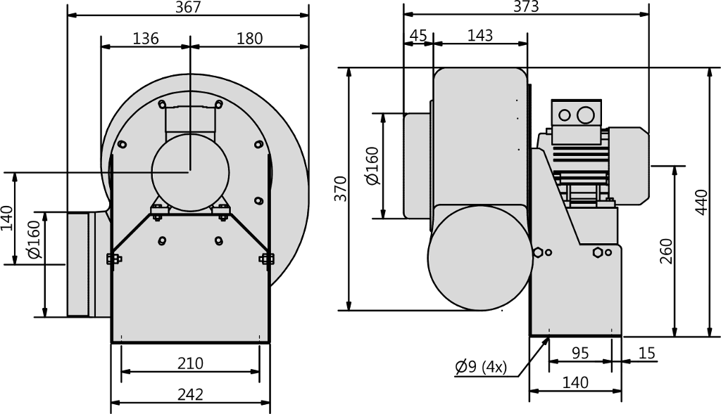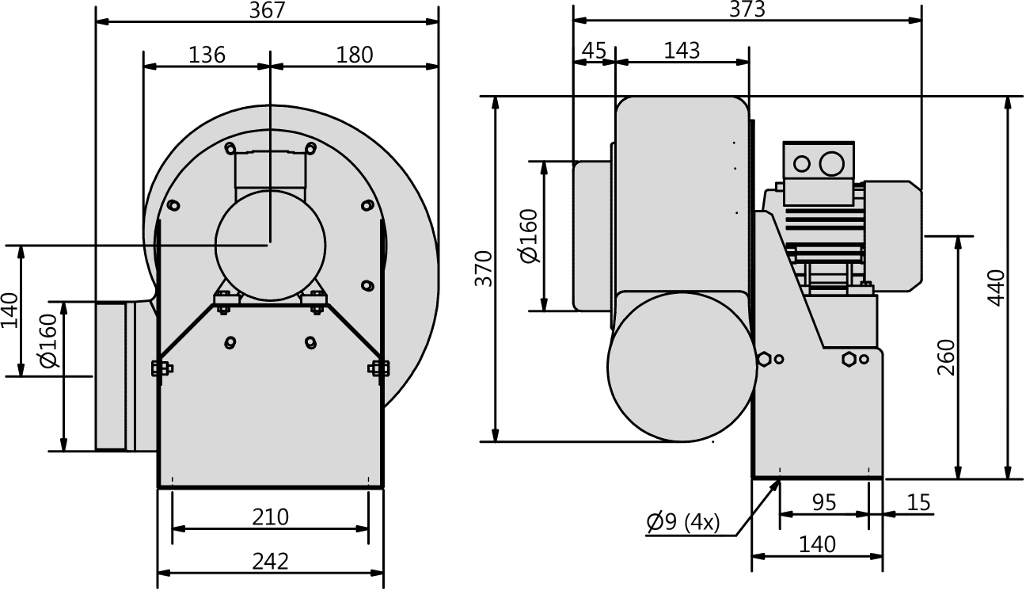 Napęd wentylatora stanowi 2-biegunowy, trójfazowy silnik konwencjonalny IEC typu B3, o regulowanej częstotliwościowo (przetwornicą częstotliwości) prędkości obrotowej, wykonany w klasie szczelności IP55.