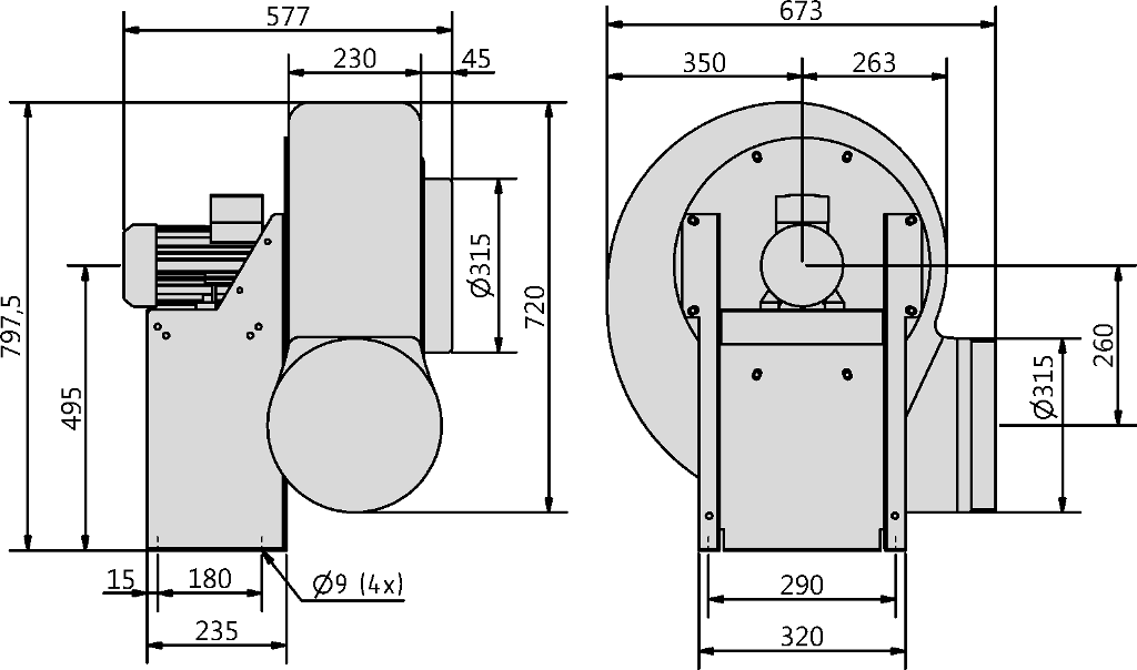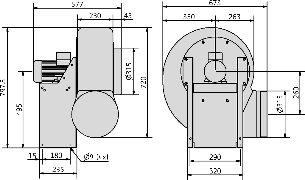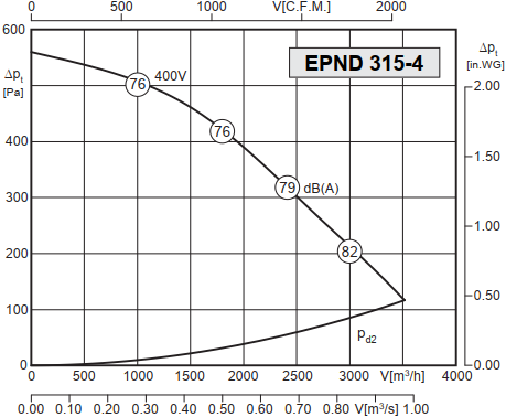 Napęd wentylatora stanowi 2-biegunowy, trójfazowy silnik konwencjonalny IEC typu B3, wykonany w klasie szczelności IP55.