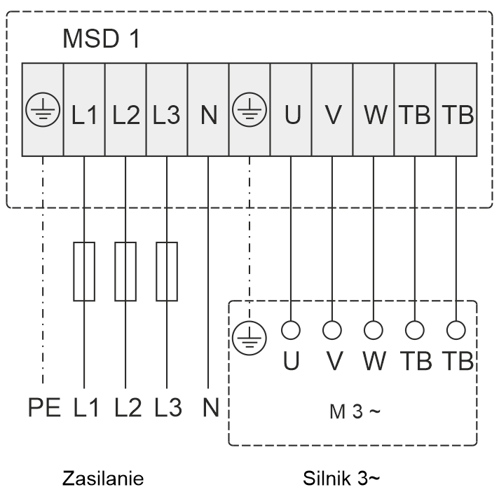 Przekaźniki MS... nie zawierają zabezpieczeń zwarciowych w torze prądowym. Zabezpieczenia dobrane do mocy silnika wentylatora należy zainstalować w tablicy, z której zasilane są przekaźniki MS... Obwody sterowania (TK, PTC, RT itd.) są zabezpieczone wspólnym bezpiecznikiem topikowym 2A. Uszkodzenie tego bezpiecznika blokuje pracę całego przekaźnika.