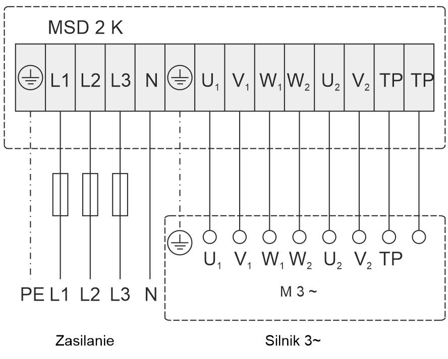Przekaźniki MS... nie zawierają zabezpieczeń zwarciowych w torze prądowym. Zabezpieczenia dobrane do mocy silnika wentylatora należy zainstalować w tablicy, z której zasilane są przekaźniki MS... Obwody sterowania (TK, PTC, RT itd.) są zabezpieczone wspólnym bezpiecznikiem topikowym 2A. Uszkodzenie tego bezpiecznika blokuje pracę całego przekaźnika.